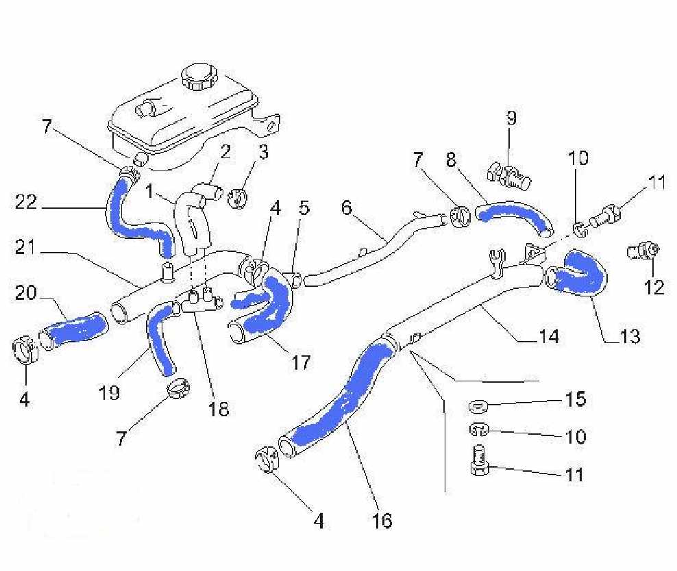 SILIKONOWY ZESTAW PRZEWODÓW UKŁADU CHŁODZENIA, stosowany w samochodach FSO POLONEZ CARO/ATU 1,4 16V z silnikiem DOHC z wtryskiem wielopunktowym (seria K16 MPI) firmy Rover o mocy 103 KM (76 kW). Przewody wchodzące w skład zestawu oznaczone są na schemacie kolorem niebieskim.